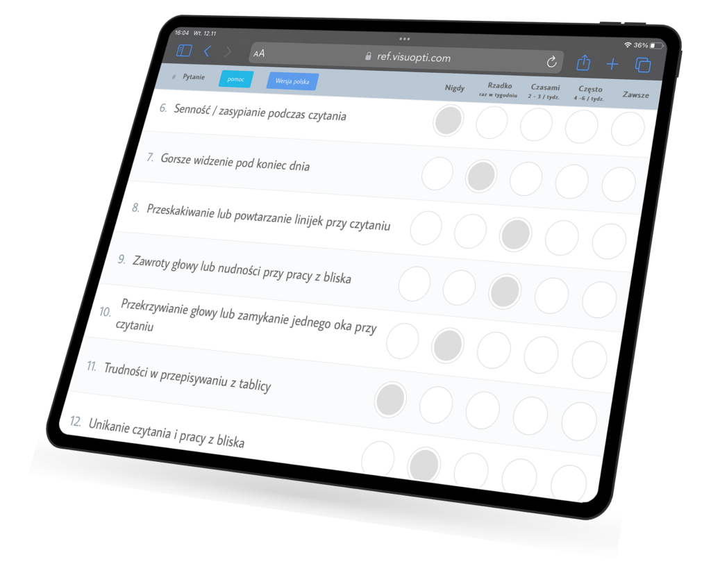 - Wystandaryzowane narzędzie stworzone przez College of Optometrist in Vision Development, pomaga wykryć dolegliwości wzrokowe uciążliwe w życiu codziennym już przed badaniem.