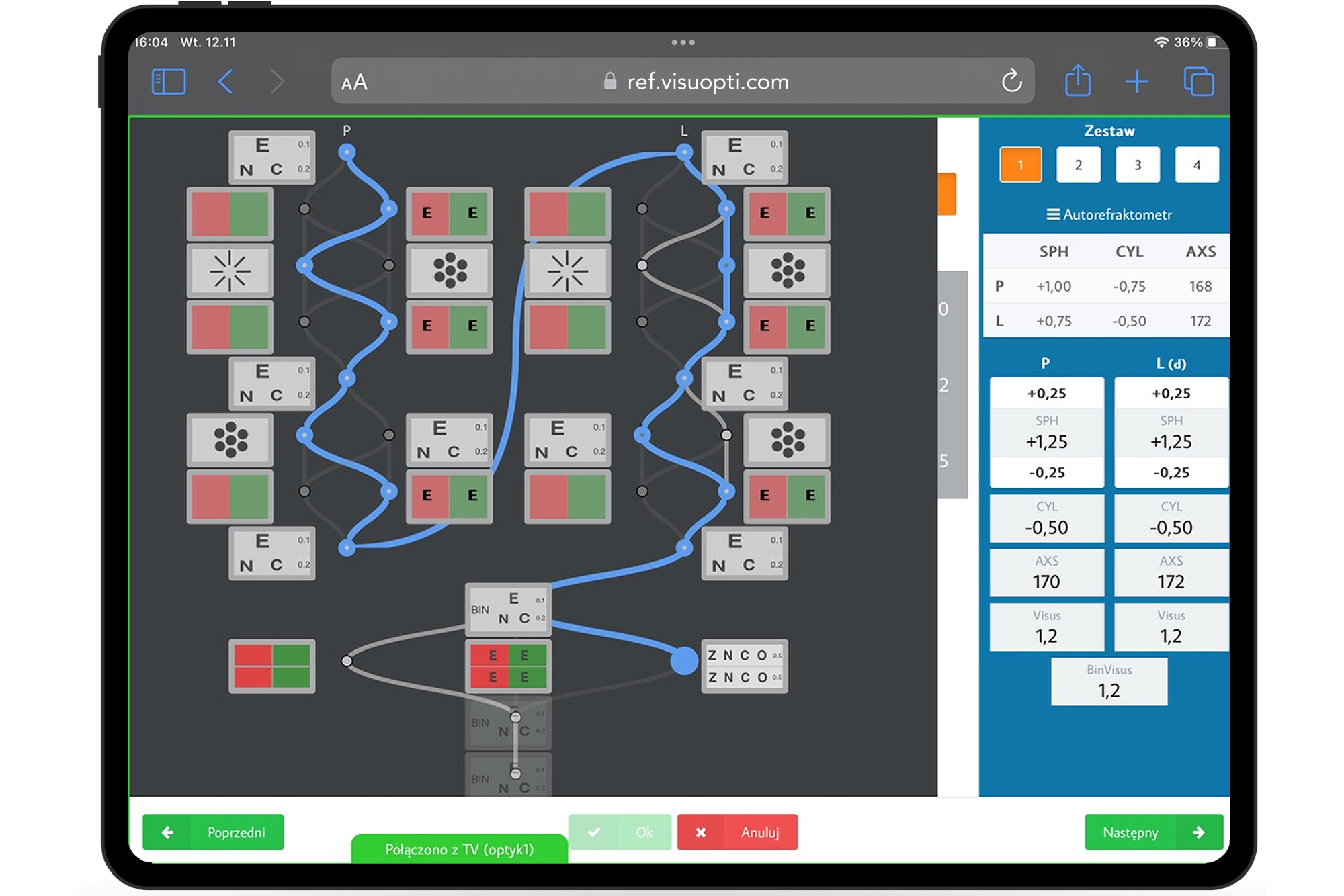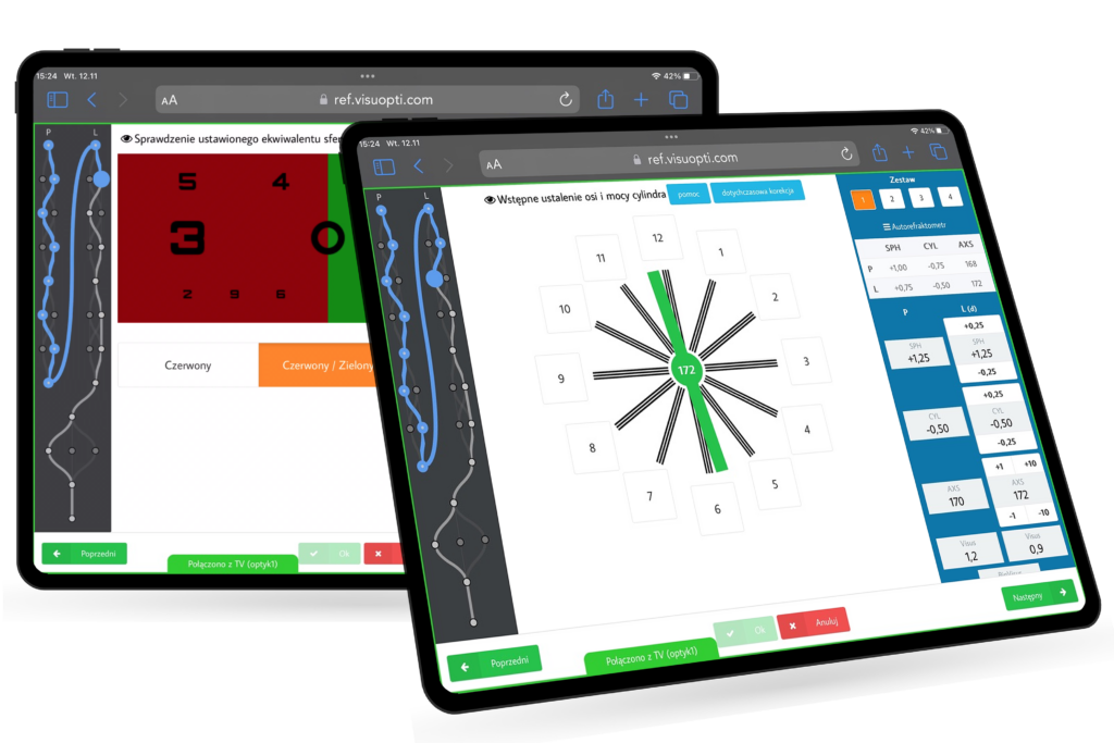 Moduły: wystandaryzowana ścieżk refrakcji, pilot – wybór testów, Ankieta Jakości Życia, wywiad medyczny, poprzednie okulary, testy przesiewowe Maddox, Worth